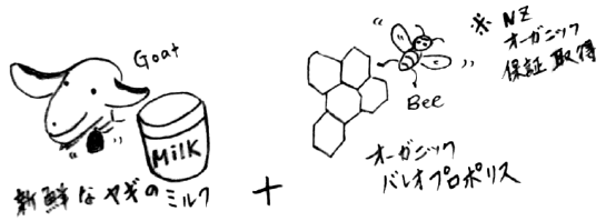 4USフェイシャルソープの原料は、新鮮なヤギのミルク、お馴染みのオーガニックバレオプロポリス、エキストラバージンオリーブオイルやココナッツオイル、良質なシアーバター、キャスターオイル(ひまし油)の6種類のみを使用。すべてオーガニックの素材から作られた、超自然派の石鹸なのです。